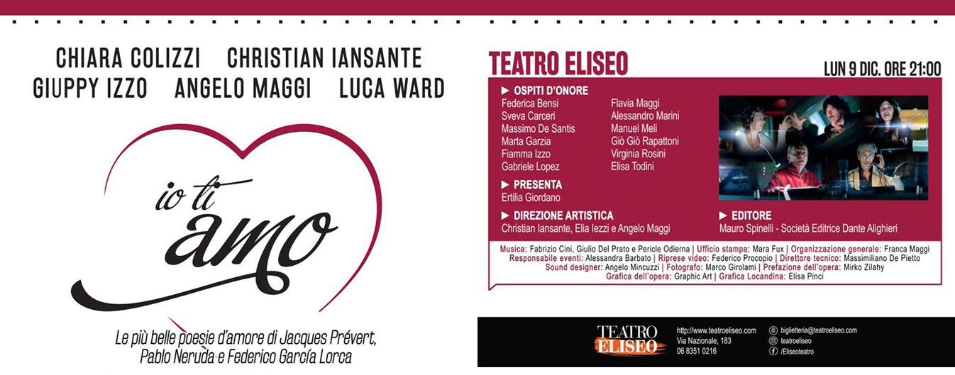 Evento in teatro per Christian Iansante, protagonista al Teatro Eliseo a Roma di “Io ti amo – Le più belle poesia di Jacques Prévert, Pablo Neruda e Federico Garcia Lorca”. Insieme a lui anche altri storici doppiatori come Chiara Colizzi, Angelo Maggi, Luca Ward e Giuppy Izzo. La direzione artistica dell’evento, oltre che allo stesso Iansante, è affidata a Elia Iezzi e Angelo Maggi.